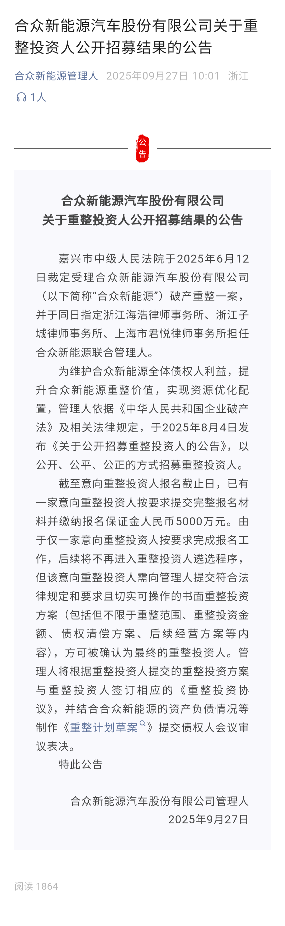 《公告》中还介绍,管理人于2025年8月4日发布《关于公开招募重整投资人的公告》,以公开、公平、公正的方式招募重整投资人。截至意向重整投资人报名截止日,已有一家意向重整投资人按要求提交完整报名材料并缴纳报名保证金人民币5000万元。由于仅一家意向重整投资人按要求完成报名工作,后续将不再进入重整投资人遴选程序,但该意向重整投资人需向管理人提交符合法律规定和要求且切实可操作的书面重整投资方案(包括但不限于重整范围、重整投资金额、债权清偿方案、后续经营方案等内容),方可被确认为最终的重整投资人。管理人将根据重整投资人提交的重整投资方案与重整投资人签订相应的《重整投资协议》,并结合合众新能源的资产负债情况等制作《重整计划草案》提交债权人会议审议表决。